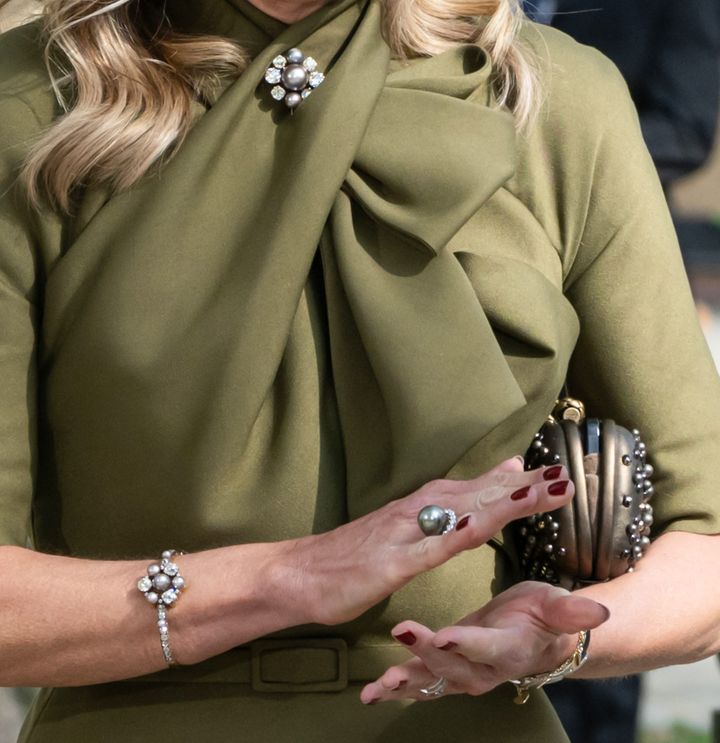 王妃はドレスのネックラインに、大きなグレーの真珠をダイヤモンドで囲んだブローチを合わせた。これは1897年のウィルヘルミナ女王の肖像画にも描かれている歴史的なジュエリーである。王妃はこのブローチにグレー真珠のイヤリングや指輪を合わせ、王室の伝統を象徴する至宝のブローチを主役にしたコーディネートを見せた。