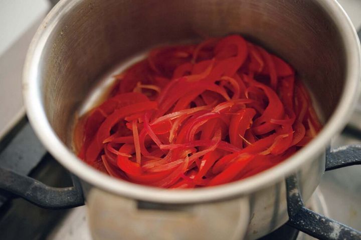 2.赤玉ネギと赤パプリカは縦に2㎜の幅で切る。鍋に入れ、赤ワインビネガー、きび砂糖、粗塩ふたつまみを加えて、フタをして弱火で15分ほど蒸し煮にする。途中、さっと混ぜる。