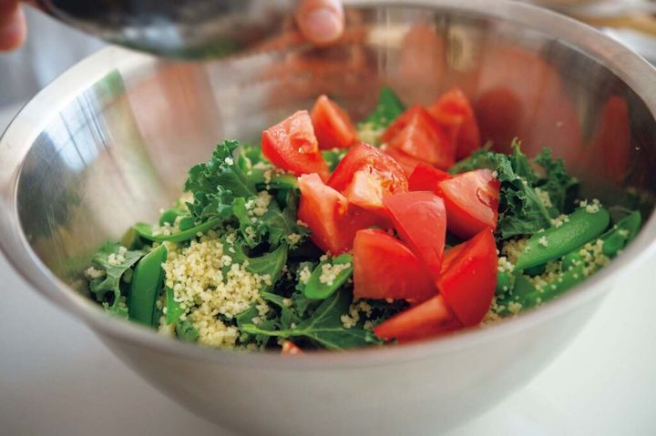 2.スナップエンドウは筋を取り、沸騰した湯で2分茹で、縦半分に開き、斜め半分に切る。ケールは葉の部分を食べやすい大きさにちぎる。トマトは8等分のくし形切りにし、横半分に切る。クスクスが入ったボウルに野菜を入れておく。
