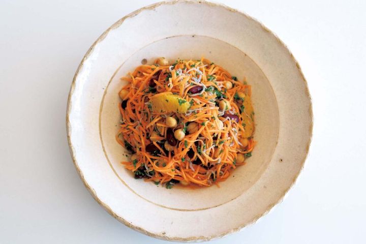 先生:次は「豆とニンジンのサラダ」です。ニンジンは皮を剥いて、長さを半分に切り、千切りにします。オレンジはナイフで房から切り出して皮に少し残った果肉から果汁を搾ります。パセリは粗めに刻みましょう。ボウルにニンジンを入れて粗塩をふり、酢、果汁、ハチミツ、ナムプラーを加えてなじませます。フライパンにオリーブオイルとチリパウダーを入れて熱して、香りがしてきたら水気をきった2種類の豆を加えてさっと炒めて。ニンジンを入れたボウルに豆、オレンジの果肉、パセリ、ちりめんじゃこを入れてオリーブオイルをまわしかけ、粗塩を加え、ボウルを振って全体を混ぜたらハイ出来上がり。