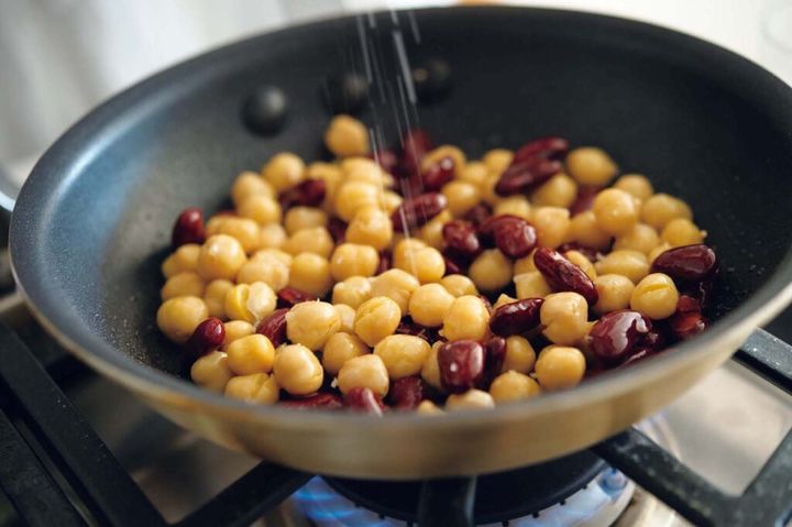 3.フライパンにオリーブオイル小さじ1、チリパウダーを入れて熱し、香りがしてきたら水気をきった豆2種を加えてさっと炒める。