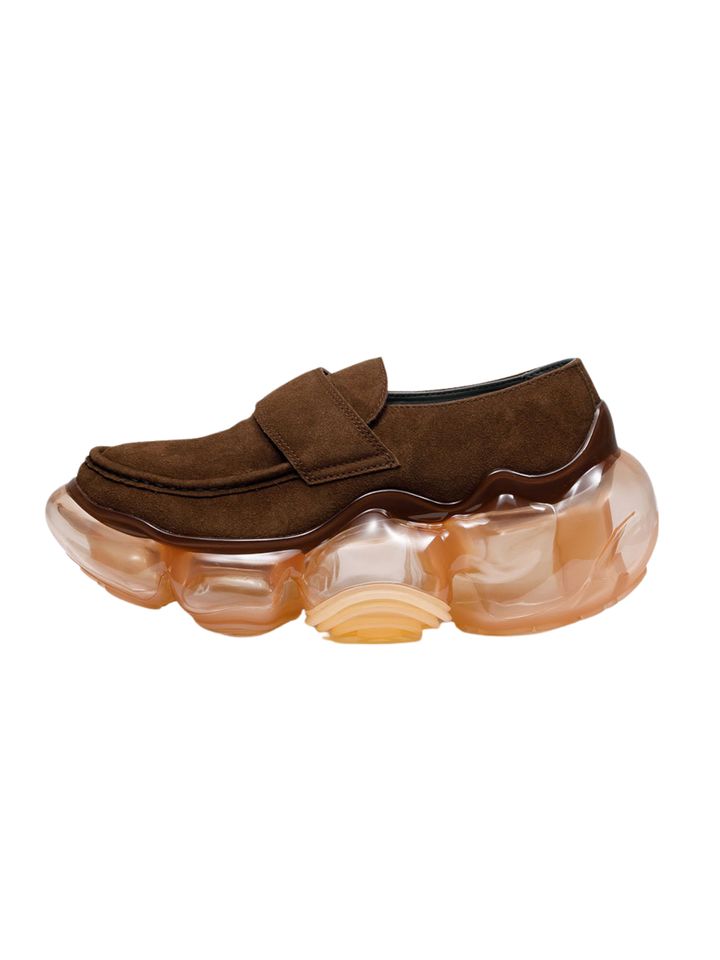「グラウンズ」を象徴する透明の球体を用いたボリュームあるアウトソールときゃしゃなアッパーのバランス感がユニークな“MOOPIE LOAFER”。履くだけで足元にインパクトを与えてくれる遊び心にあふれたデザインは、たとえ合わせる服装がシンプルでもコーデ全体を華やかにしてくれるはず。ブラウン×タンのカラーリングも春夏らしさを演出。