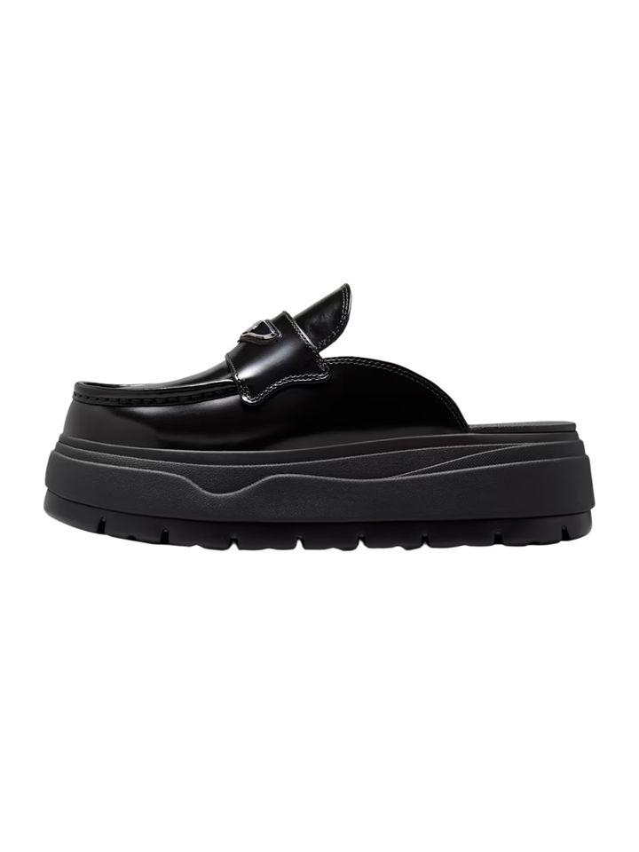 クラシックなローファー型のアッパー×厚底のプラットフォームというかっちりしたシューズを、かかとが見えるデザインにすることでほどよい抜け感をプラス。柔らかいフォームのプラットフォームは快適さを実現し、同時に普段使いに十分な耐久性も兼ね備えた一足。上質なメタルのアクセントはエレガントさを演出し、カジュアルスタイルやストリートスタイルに合わせても洗練された印象に。