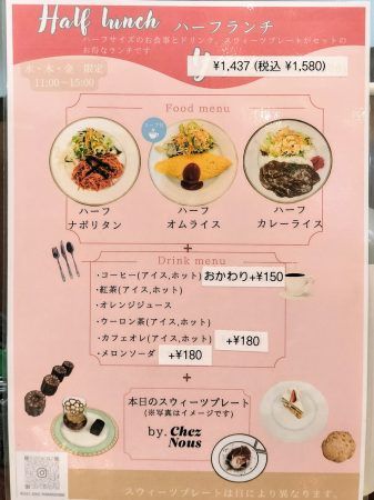 そしてリニューアルと同時に登場したのがこちらのハーフランチ。 ハーフサイズのメイン料理とドリンク、パティスリー特製のスイーツプレートがセットになっていて、食事もスイーツも楽しみたい方にぴったり。 ハーフランチは水・木・金のランチタイム限定なのでご注意を。