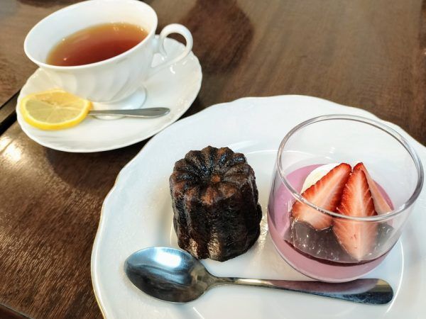 日替わりのスイーツプレートはカシスのパンナコッタとカヌレでした。 カシスのパンナコッタは生クリームのコクとカシスの甘酸っぱさが絶妙にマッチしていて、一口目からカシスの香りが広がります。 自家製のカヌレは外側がカリカリ、内側がもっちりとした食感で、ラム酒の香りが効いた大人の味わいです。