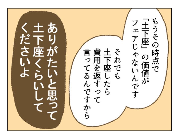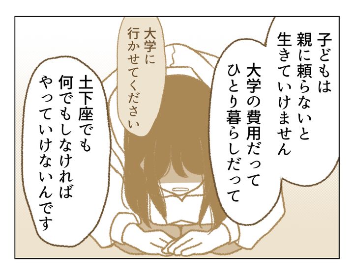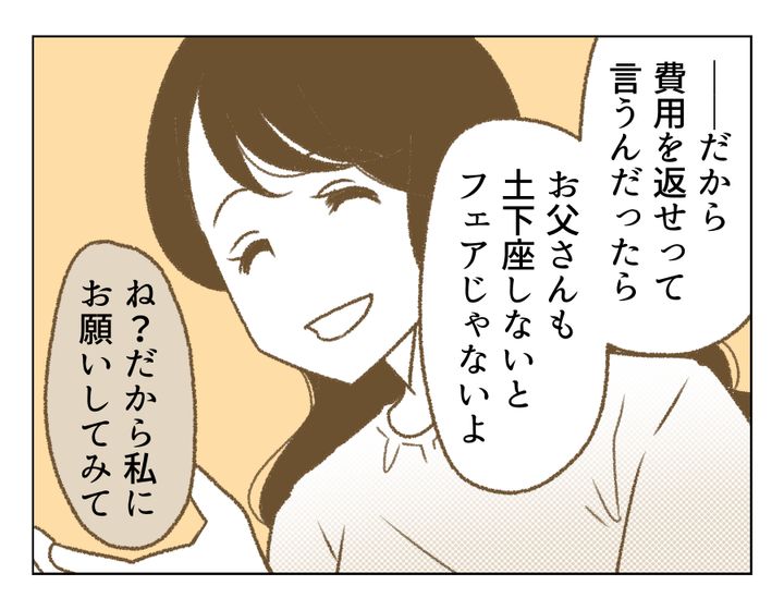 私(ミサト)は夫のヒデキと2人暮らし。10年前、娘のアカリが大学受験のとき、夫はアカリに発破をかけるためにアカリに土下座をさせました。そのおかげもあり見事に国立大学に合格、アカリは家を出ていきました。それ以降ほとんど実家に帰ってきません。そんなある日、夫が仕事を辞めてしまったのです。新しい仕事は決まらず、貯金は減る一方。アカリと連絡を取ろうと手を尽くし、なんとか会うことができました。アカリが大学に進学できたのは夫のおかげ。その進学費用の返金を求めると、全額返金が可能だと言うアカリ。しかし「だったら土下座して?」と言い出して……?