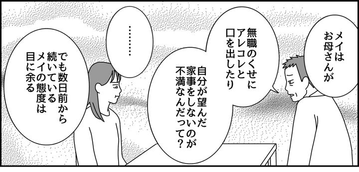 メイはずっと不機嫌な様子です。カズマがメイに話を聞こうとすると、メイは「お母さんは無職のくせに偉そう」「時代に逆行して仕事も辞めて楽してる」と、自分が働いているあいだに家事をしない私に腹が立つと主張してきました。