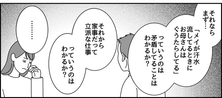 カズマは、「お前が仕事をしているあいだ、お母さんは家事をしてくれているんだ」と冷静に諭します。さらに「家事だって立派な仕事だ」ときっぱりと言ったことで、メイは反論できずに黙り込んでしまいました。私は成り行きを見守ることしかできません。