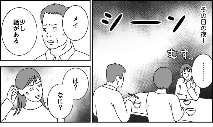 夕食後、夫のカズマが静かにメイに話しかけました。