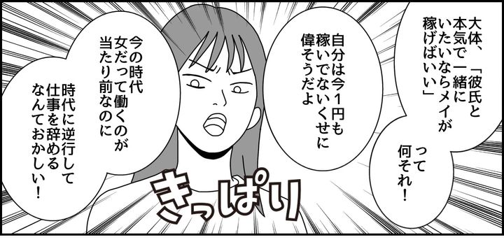「自分は今1円も稼いでないくせに偉そう」「今の時代、女だって働くのが当たり前」「仕事を辞めるなんて時代に逆行してる」と、メイは私に対して思っていたことをきっぱりと言いました。