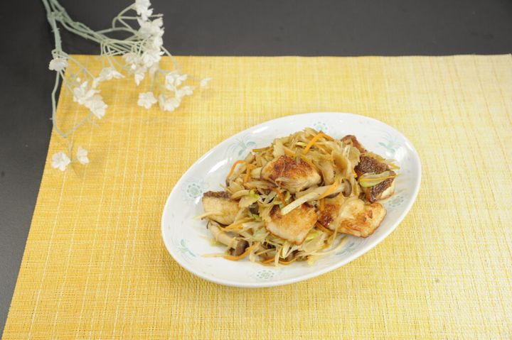 (7)(6)に(5)を戻し入れ、(4)を少量ずつ加えて強火で炒め合わせ、器に盛りつける。