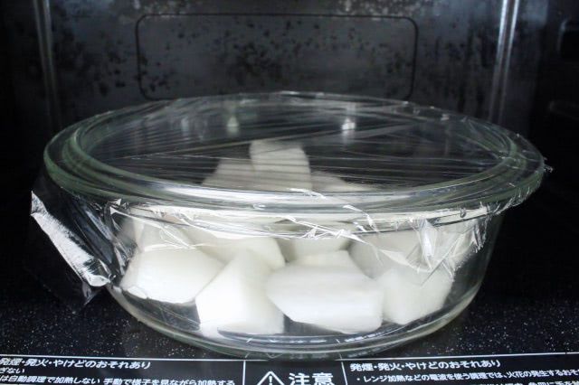 大根は茹でる前に、電子レンジであらかじめ火を通しておきます。