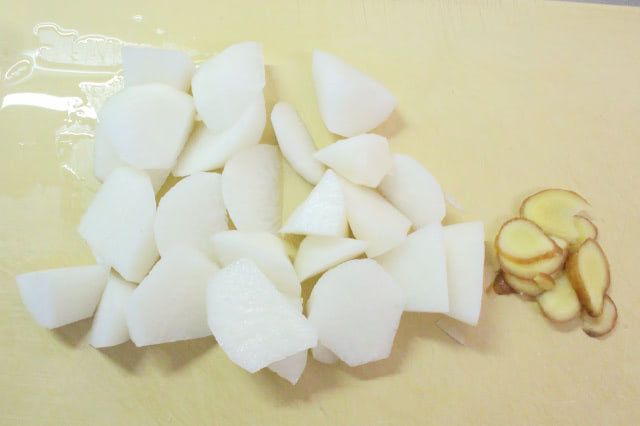 1. 皮を剥いた大根を乱切りに、しょうがを薄切りにします。