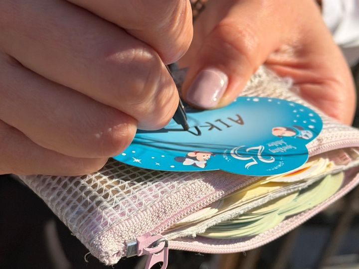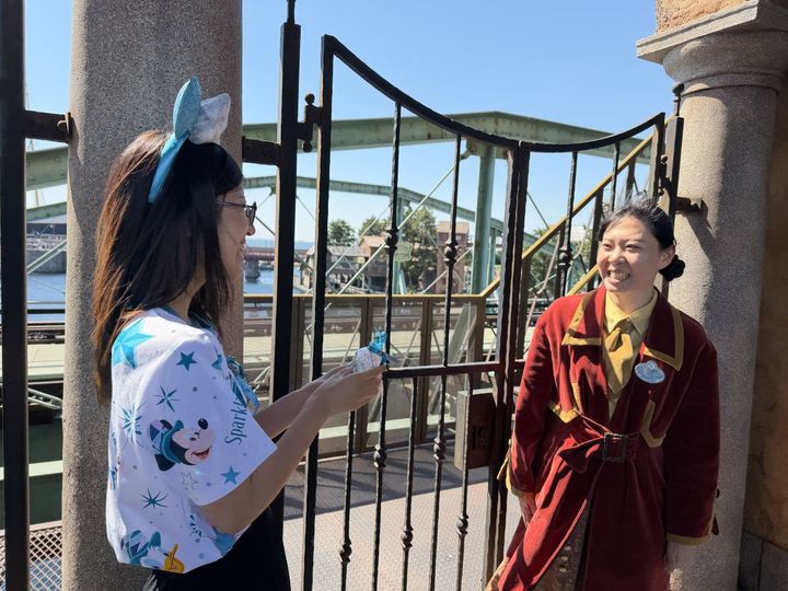さらに、キャストの胸についているネームタグをデザインしたシールも無料でもらえます。ネームタグに自分の名前を書き込んで渡してくれるんです! キャストに「25周年のシールください!」と声をかけてみましょう。