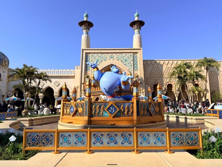 アラビアンコーストの広場には、ディズニー映画『アラジン』のジーニーのフォトスポットが登場。日没後はジュビリーブルーにライトアップされて華やかに。時折音楽がかかって、光と音の演出が楽しめますよ。