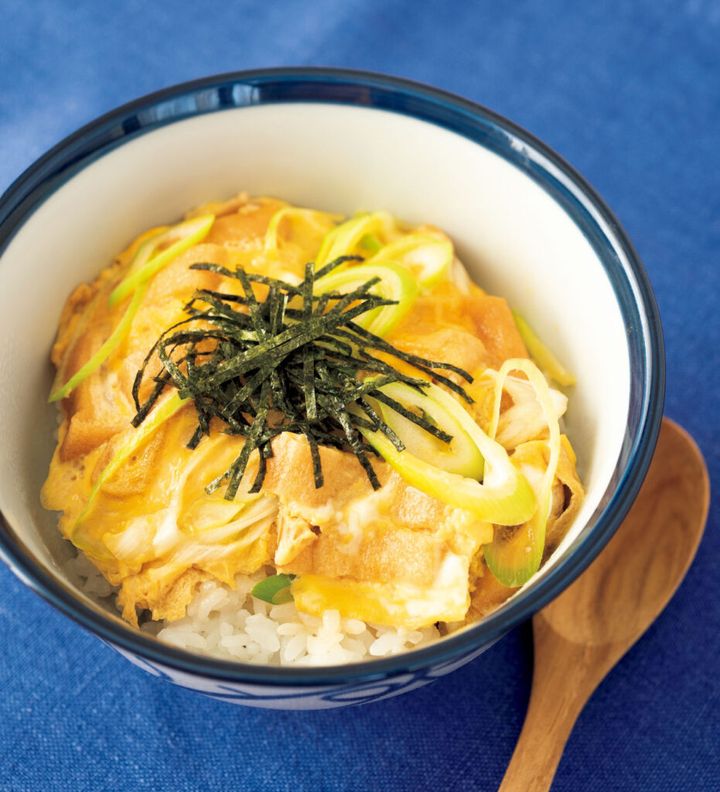 お肉を使わずに、しっかり満足。お揚げ(油揚げ)と九条ねぎをだしで煮て卵でとじた、京都のご当地どんぶり「衣笠丼」。金閣寺近くの衣笠山の姿を思わせることから、その名がついたともいわれています(諸説あり)。