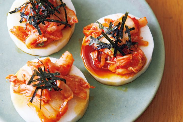 長いもは皮をむき、幅1cmの輪切りにして器に並べる。キムチは大きければ食べやすい大きさに切り、長いもに等分にのせる。しょうゆをかけ、刻みのりをのせる。