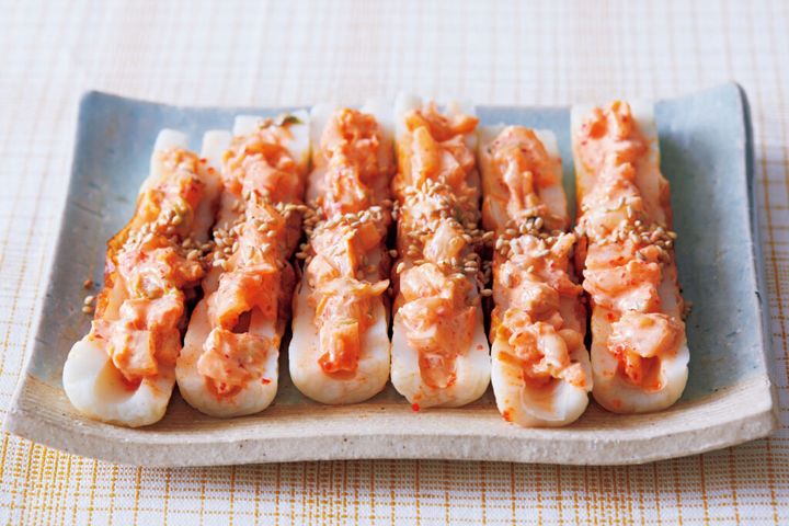 ちくわは縦半分に切り、器に並べる。キムチは粗みじんに刻んでボールに入れ、マヨネーズを加えて混ぜる。キムチマヨをちくわのくぼみに等分にのせ、白いりごまをふる。