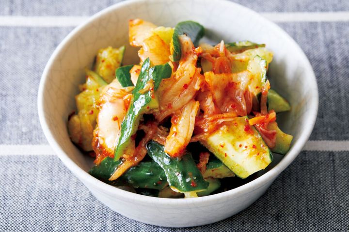 きゅうりは両端を切ってめん棒などでたたき、一口大に割る。キムチは大きければ食べやすい大きさに切る。ボールにきゅうり、キムチ、ごま油を入れて、あえる。
