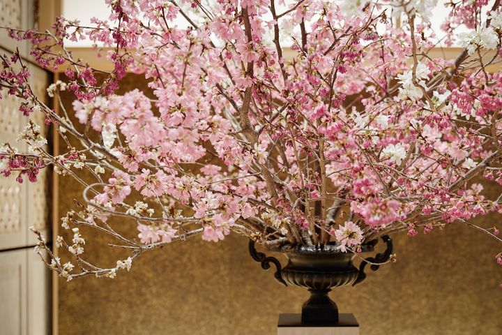 この時季、青森ヒバの一枚板で作られた正面玄関の扉を開けると、桃や桜をあしらった室礼がゲストを歓迎。日本の四季の豊かさを感じることができるはずだ。