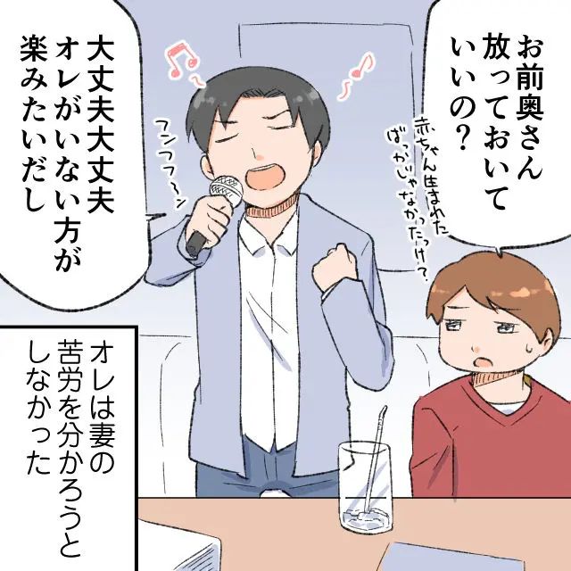 友達に「お前、奥さん放っておいていいの?赤ちゃん産まれたばっかじゃなかったっけ?」と言われるも、「大丈夫大丈夫。俺がいない方が楽みたいだし」と答え、俺は妻の苦労を全く分かろうとしていなかったのです。