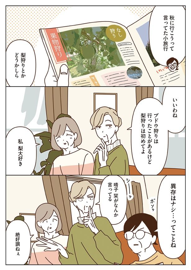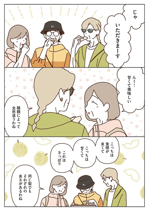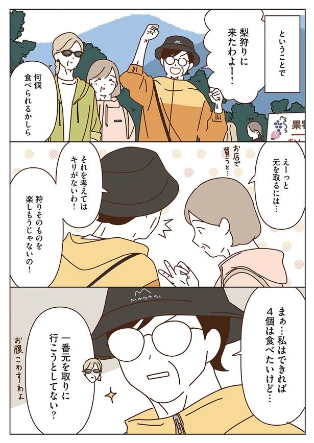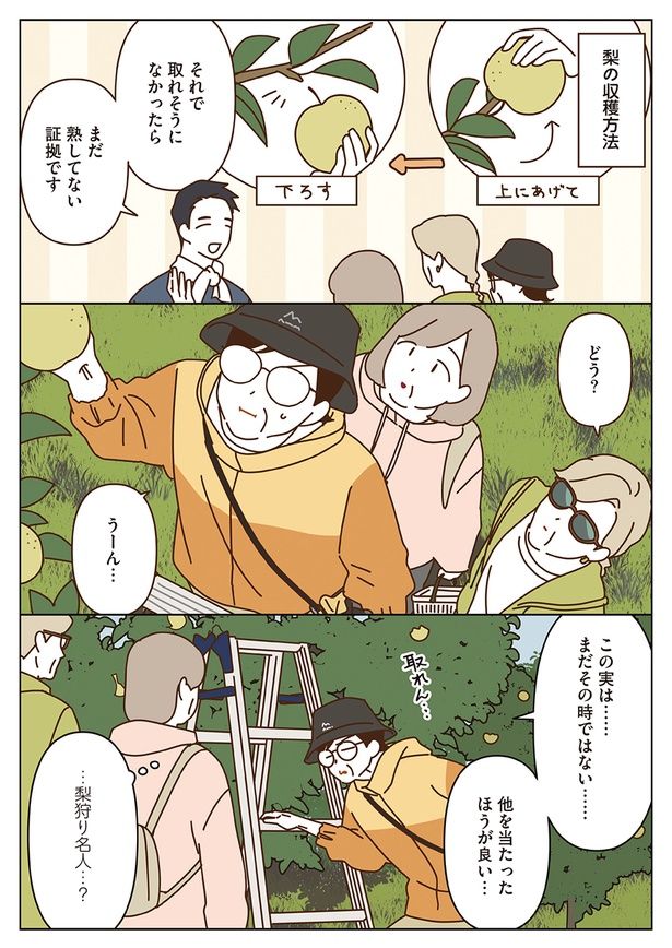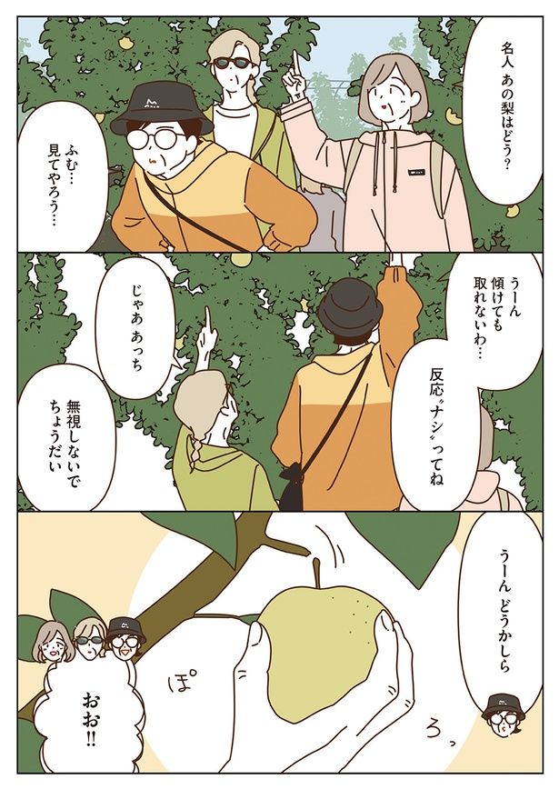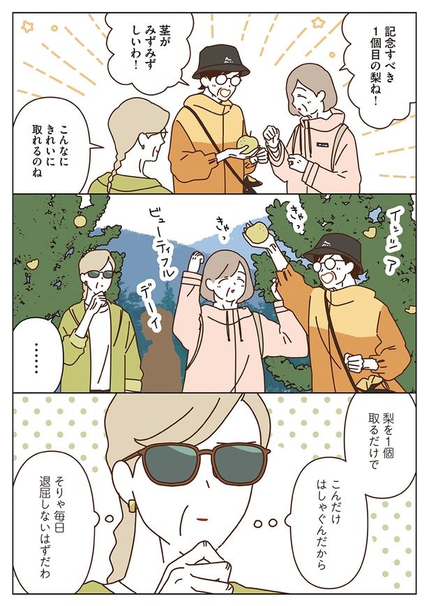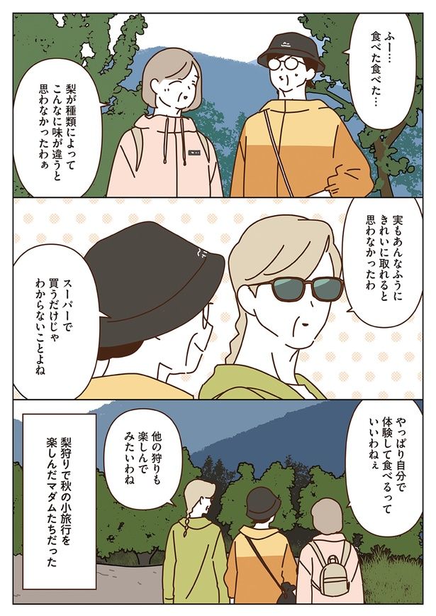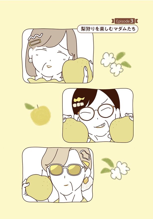 3. 秋の小旅行で梨狩りにやって来たマダムたち。1個採れただけで大はしゃぎ!/マダムたちのルームシェア6㊾