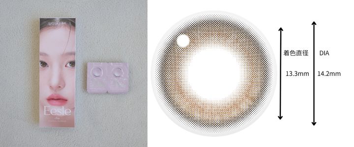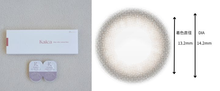 DIAは14.2mmと平均的なサイズながら、しっかり瞳に溶け込んで見えるのは、柔らかな淡色がヴェールのようにふわりと重なる繊細な着色のおかげ。