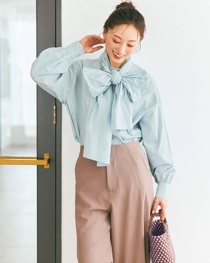 ②ママ友にも好印象!学校行事にも使える「リボンボウタイブラウス」