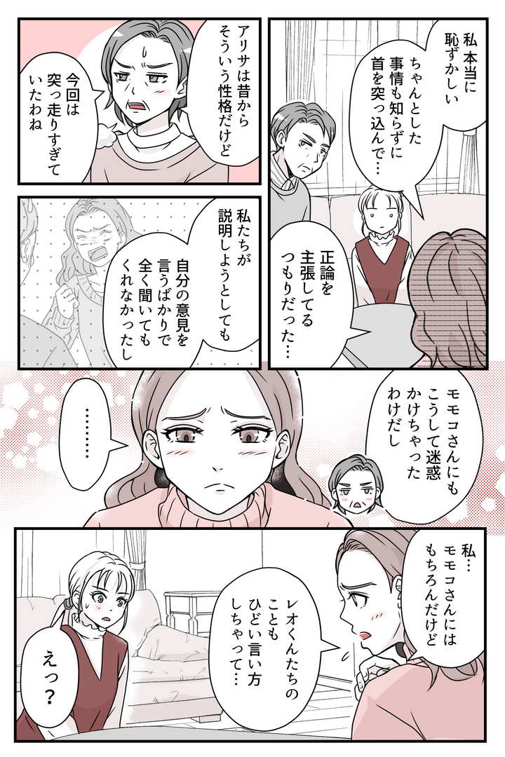 アリサさんはタツキがギャンブルにハマっているという真実を知って、ショックを受けている様子でした。義両親はそんなアリサさんに、淡々と状況を説明します。アリサさんは自分がこれまで主張してきたことが、いかに見当違いで恥ずかしいものだったか、ようやく理解したような表情をしていました。