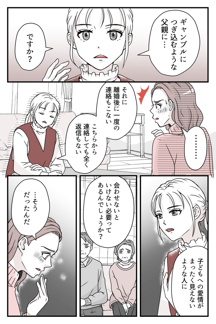 しかしそれでもなお「父親として無償で会わせてあげてほしい」と主張するアリサさん。さすがに呆れた私は、「子どものためのお金をギャンブルに使い、こちらからの連絡も無視する父親に会わせる意味はあると思う?」と問いかけました。