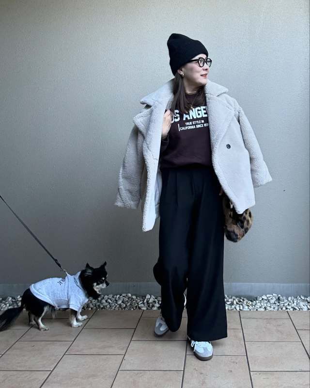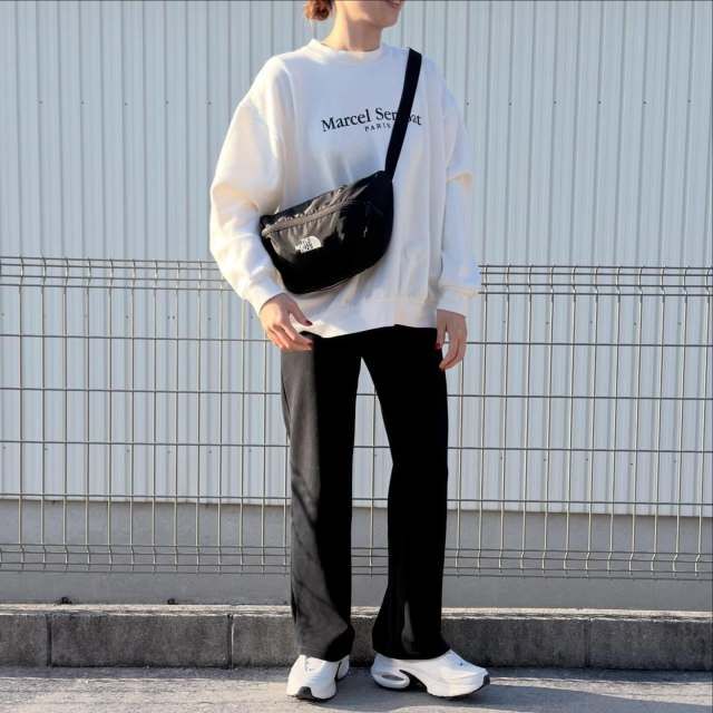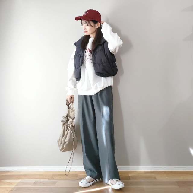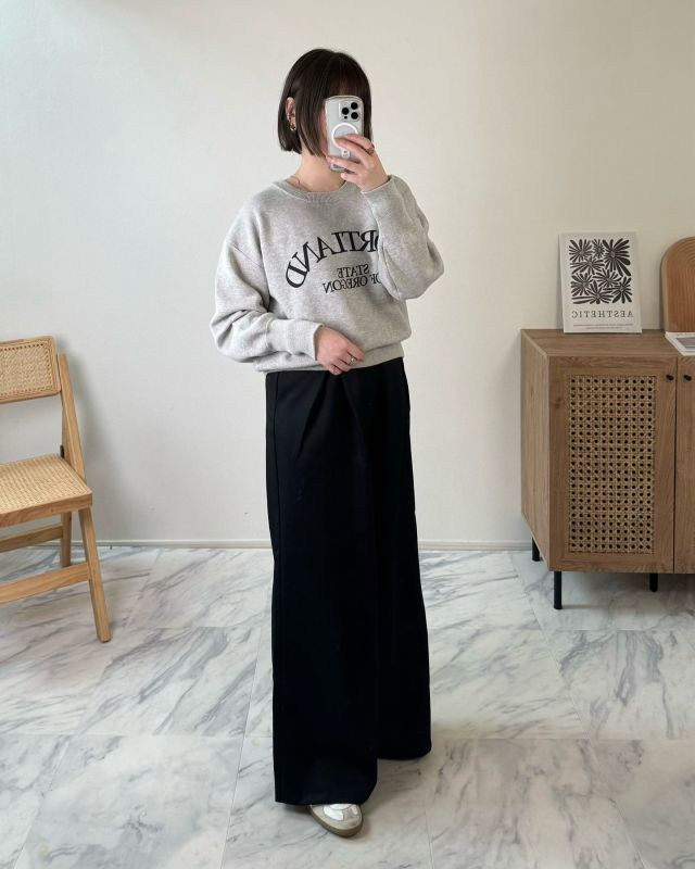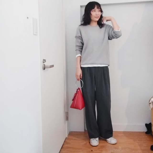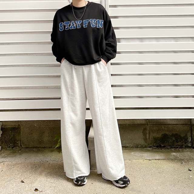 スウェット×スニーカー×タックワイドパンツのコーデ