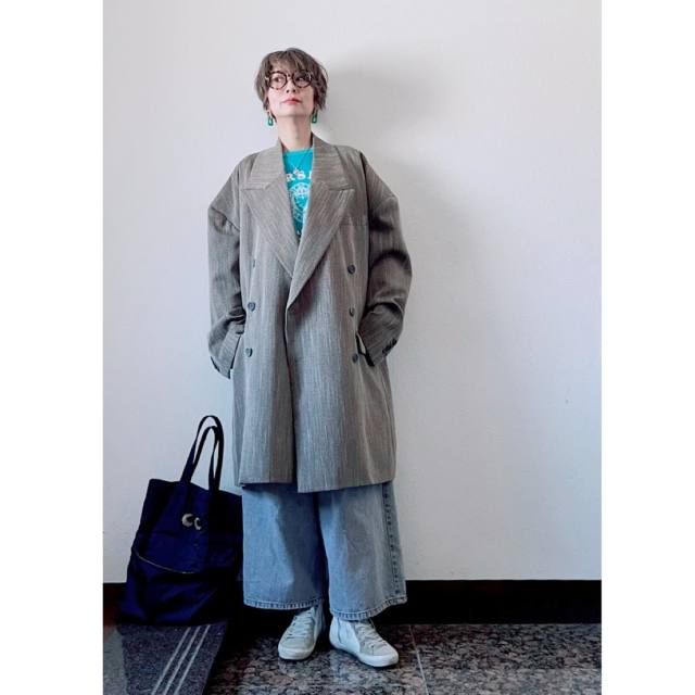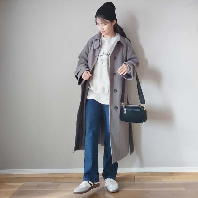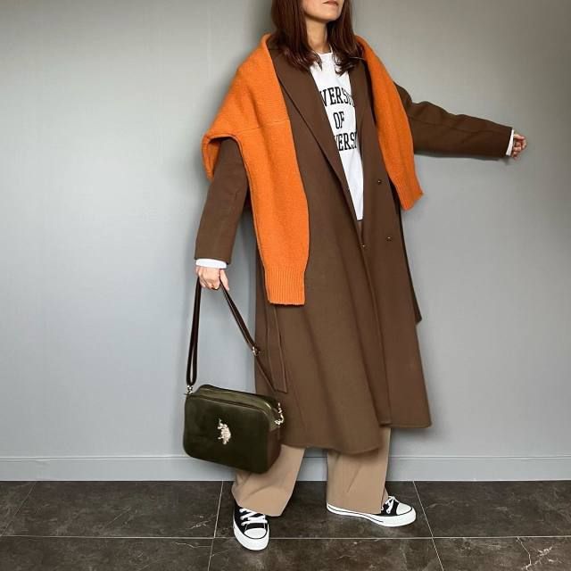 スウェット×スニーカー×チェスターコートのコーデ