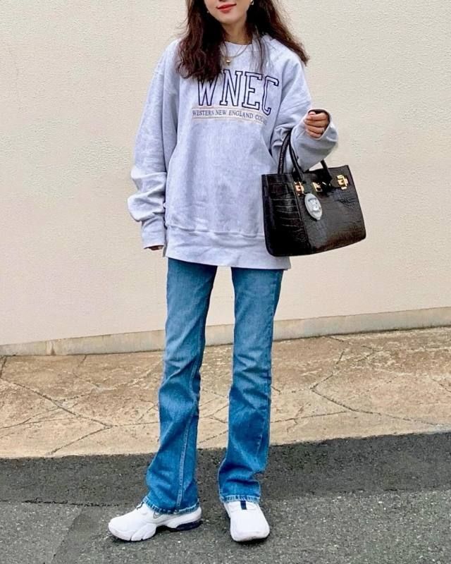 スウェット×スニーカー×デニムパンツのコーデ