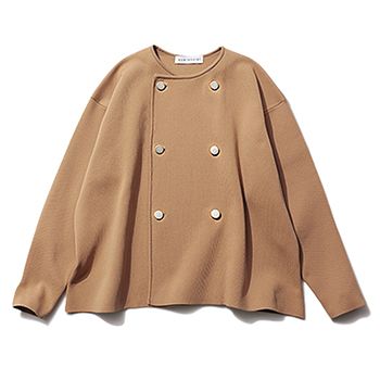 ベージュジャケットトップス/カランシエル(シップス インフォメーションセンター) ノーカラーなので首元がすっきり見え、ブラウスやタートルネックとも好相性。カーディガン感覚の軽やかな着心地ながら、ジャケットに引けを取らない端正な佇まいで、装いに大人の品格を添えてくれる。