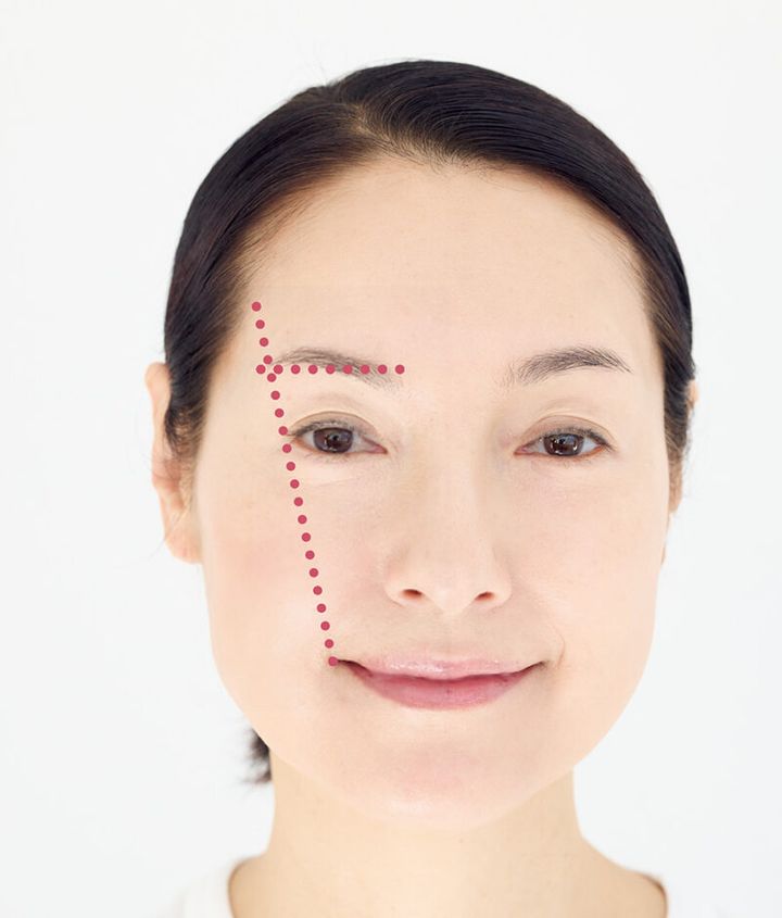 眉尻は、口角と目尻を結んだ延長線上で、眉頭よりも下がらない位置に決める。