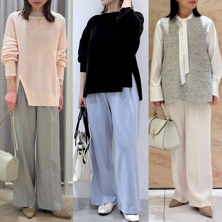 小物を含めピンク&グレージュでまとめた配色も、上品でフェミニンなパンツコーデに仕上がるポイントです。