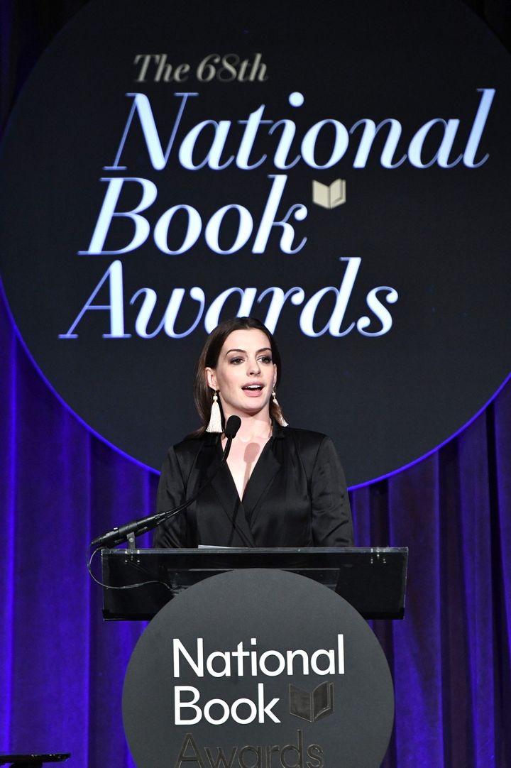 写真/第68回National Book Awardsで、出演作『ブロークバック・マウンテン』の原作者エドナ・アニー・プルーに文学功労賞を授与するため登壇したハサウェイ。