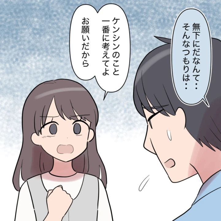 「無下にだなんて・・そんなつもりは・・」シンジはそう言いました。きっと本心なのだと思います。でも、実際にシンジがカオルさんやタイガくんを優先することでケンシンも私も寂しい思いをしたり傷ついたりしているのです。「ケンシンのこと一番に考えてよ。お願いだから」私は必死にシンジに訴えました。