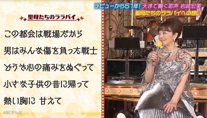 岩崎が歌い始めて早40年以上が経つ「聖母たちのララバイ」。岩崎いわく、リリース当時はまだ23歳だったため、「戦士」や「戦場」といった歌詞がピンと来なかったという。しかしある日の公演をきっかけに、「みんなを励まさなければいけない」という使命感に駆られ、以降は同曲に対する向き合い方が変わったそうだ。
