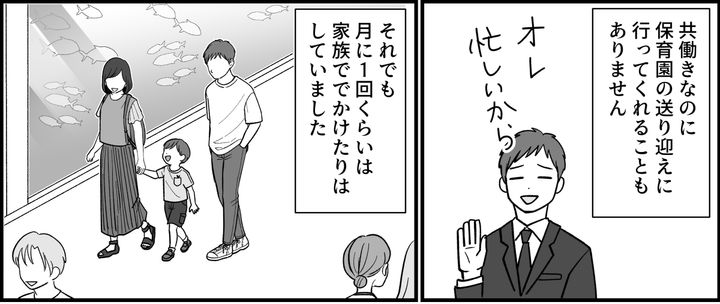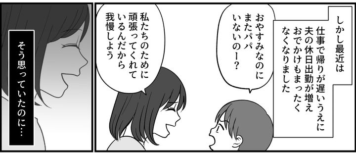 しかし夫は、最近休日出勤が増えました。仕事の都合で帰りも遅くなりました。たまにしていた、家族でのおでかけもまったくなくなりました。