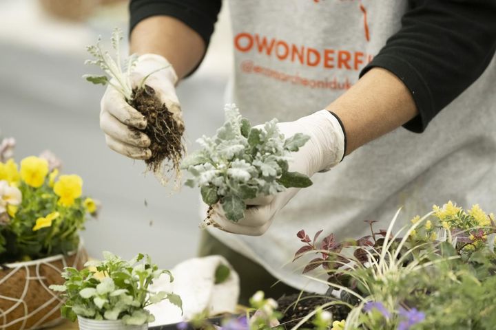 今回、実演したのはオニちゃんの代名詞ともいえるリングバスケットを使った寄せ植え。イベントで披露された、おしゃれで失敗知らずの寄せ植えのルールを紹介します。
