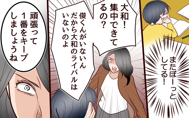 息子が中学受験塾のクラスでついに1位に…! しかし喜んだのもつかの間、いつもトップだった子が転塾したことを知らされました。息子をライバルとして扱われなかった悔しさを夫に伝えても、なぜか夫は私を諫めようとしてきて…。そんな夫の態度にも幻滅した私は、息子が受験に勝ち抜くために余計なものは排除しなければと考えるようになっていきました。