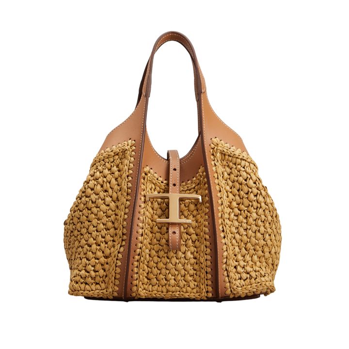 ラフィア風素材のクロシェ編みにカーフレザーを組み合わせ、ブランドのクラフトマンシップが光る。アイコニックな「T タイムレス」のメタルパーツがアクセントに。取り外し可能なファスナー付きポーチとショルダーストラップが付属。