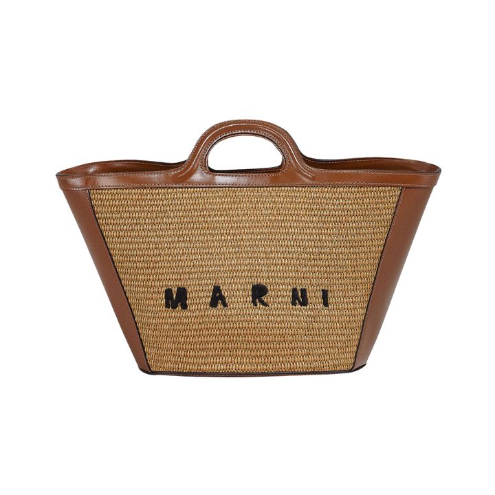 マルニからは、織地のナチュラルな風合いに、ブラウンレザーのトリミングが映えるハンドバッグがお目見え。ハンドキャリーとクロスボディの2WAYで楽しめ、小さすぎないサイズ感なのでマイクロバッグが苦手な人にもおすすめ。