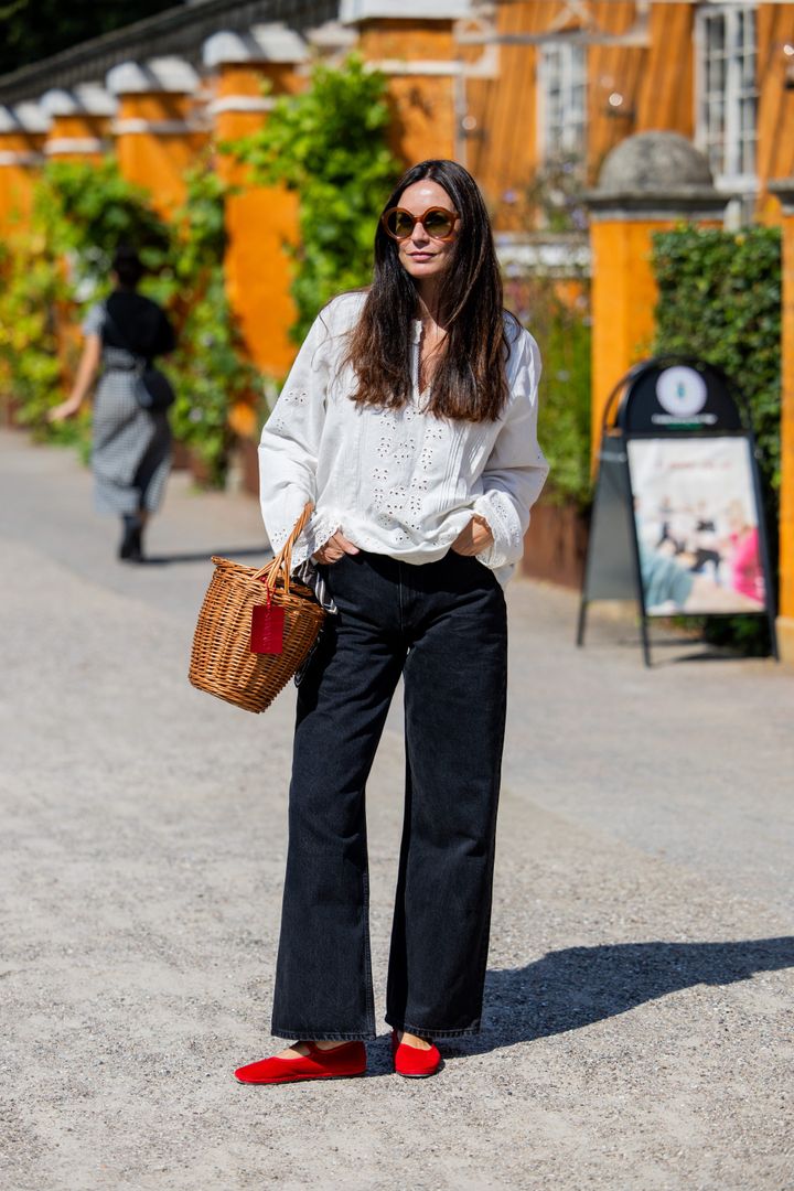 クリーンな白シャツにブラックデニムを合わせたシンプルな装いに、ウィッカー素材のかごバッグでナチュラルなアクセントをプラス。かっちりとした編み地とブラウンの色味が、カジュアルなスタイルをほどよく引き締めてくれる。