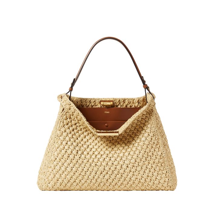 ナチュラルなラフィア素材に、ブラウンレザーのトリミングが映える「フェンディ ウェイ」。ざっくりとした編み地が軽やかな抜け感を演出し、ゴールドの金具がリュクスなアクセントに。トレンドの“開けっぱなし”のデザインを活かしてラフに持ちたい。