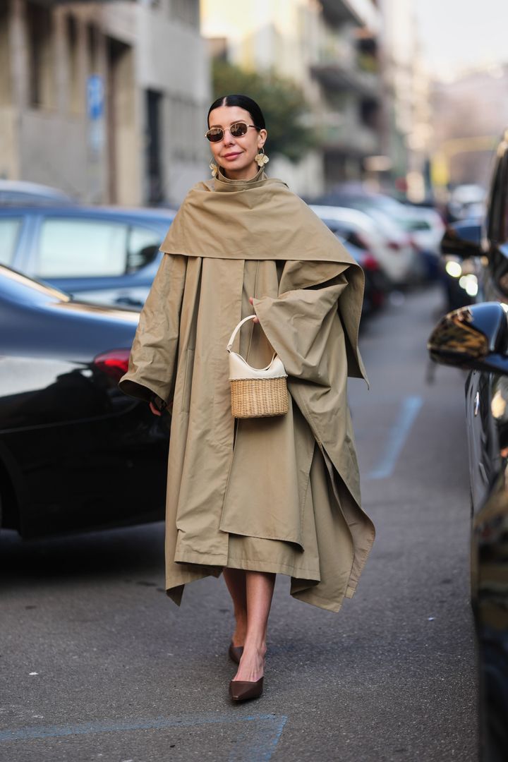 ボリュームのあるケープコートに、コンパクトなかごバッグを添えて軽やかなバランスが完成。ラフィアのナチュラルな質感に、白レザーのクリーンなコントラストが映え、ベージュのワントーンをぐっと洗練された印象に引き上げる。