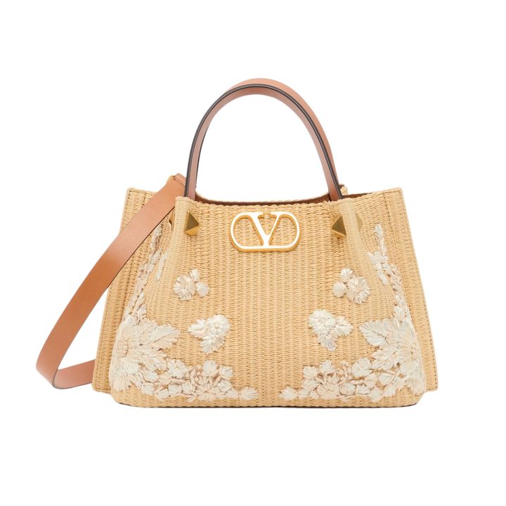 カジュアルなかごバッグながらも、フローラルの刺繍がエレガント。さらにフロントにあしらったアイコニックなVロゴがラグジュアリーな雰囲気を醸し出す。コンパクトながらストラップ付きで、ハンドでもクロスボディでも楽しめる一品。