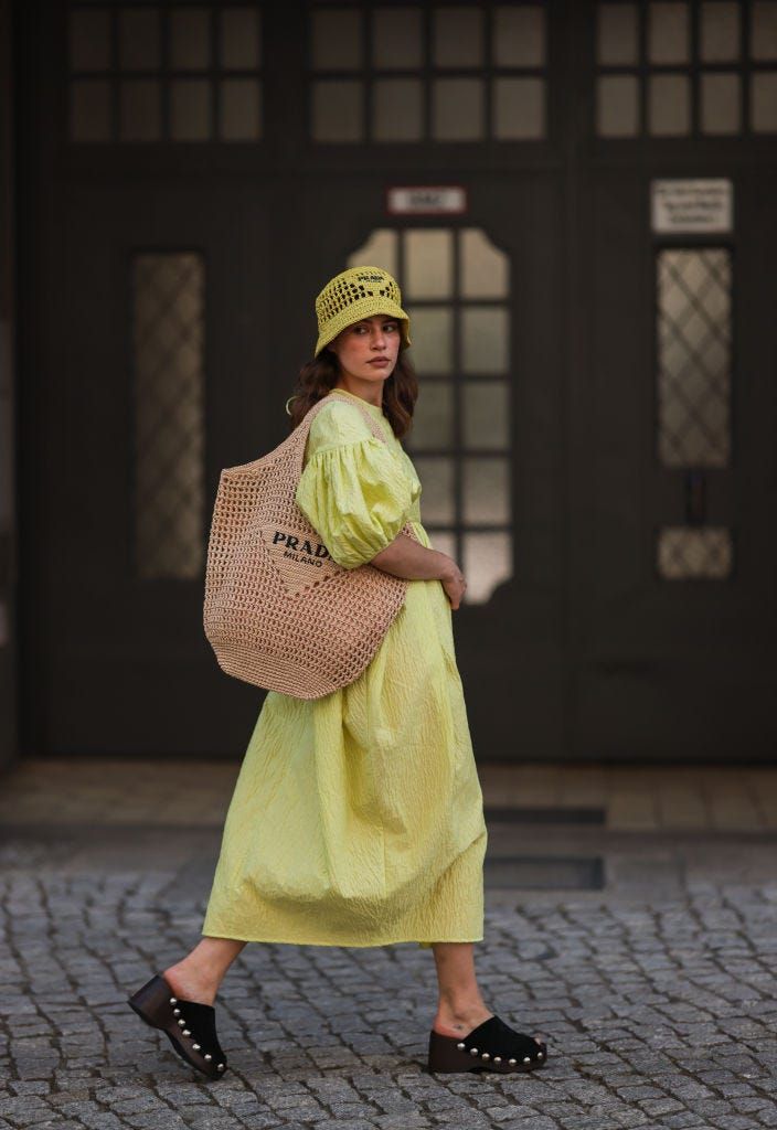 軽やかなイエロードレスに、ラフィアのトートバッグを合わせて季節感を強調。同じくクロシェ編みのハットをリンクさせることで素材の統一感が生まれ、完成度の高いスタイルに。