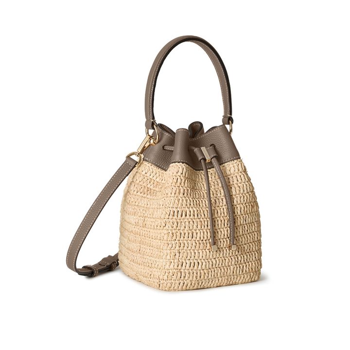 ラフィア素材を使用した、ブランド初のバケットバッグ。ドローストリング仕様による立体的なフォルムに、レザーとのコンビネーションがモダンな印象をプラス。